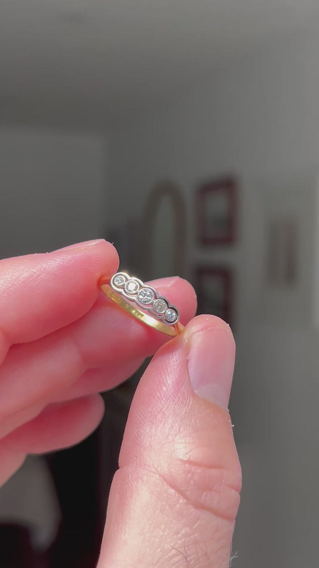 This is a beautiful antique Victorian diamond five stone ring. The ring features five beautiful old cut diamonds in a rubover openwork setting crafted in 18ct yellow gold and platinum. This ring would make the perfect anniversary or engagement ring.