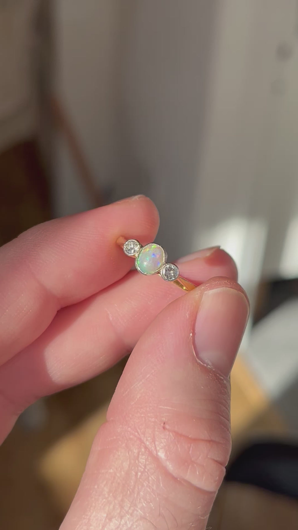 This is a fine antique Edwardian opal and diamond three stone ring. The ring features a vibrant oval cabochon opal in the centre with a diamond set either side in an 18ct yellow gold and platinum mount.