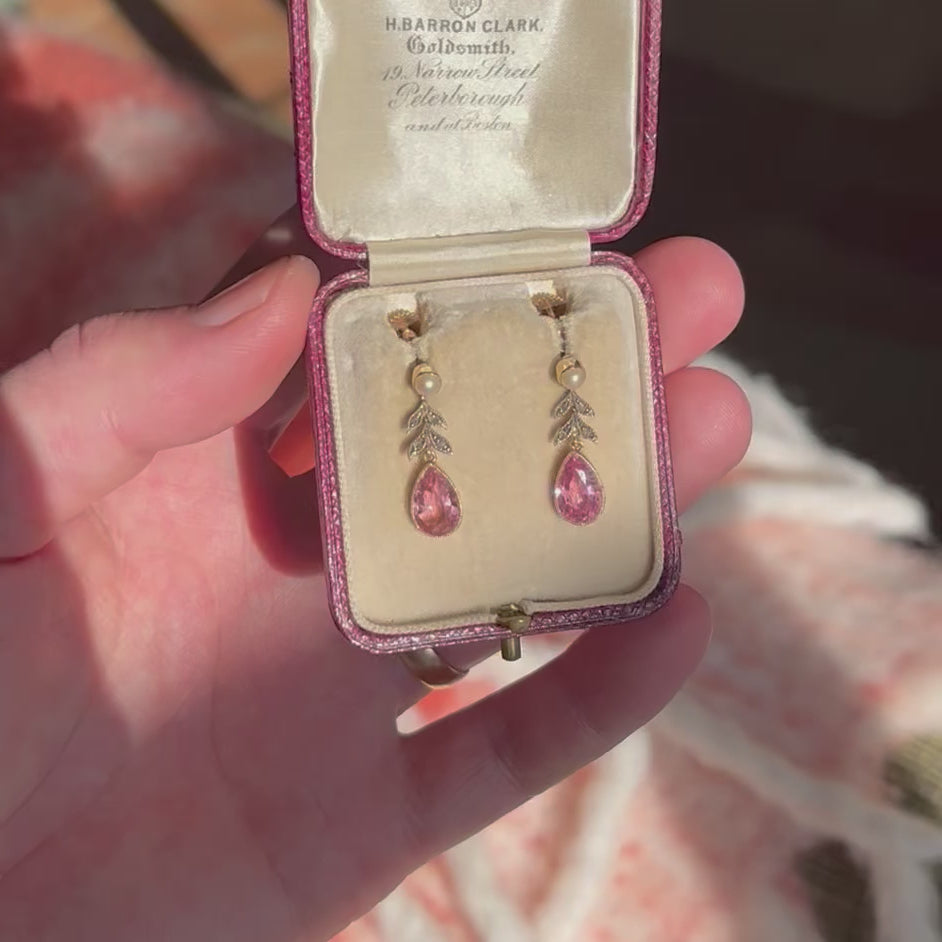 Edwardian Pink Tourmaline, Diamond and Pearl Drop Earrings