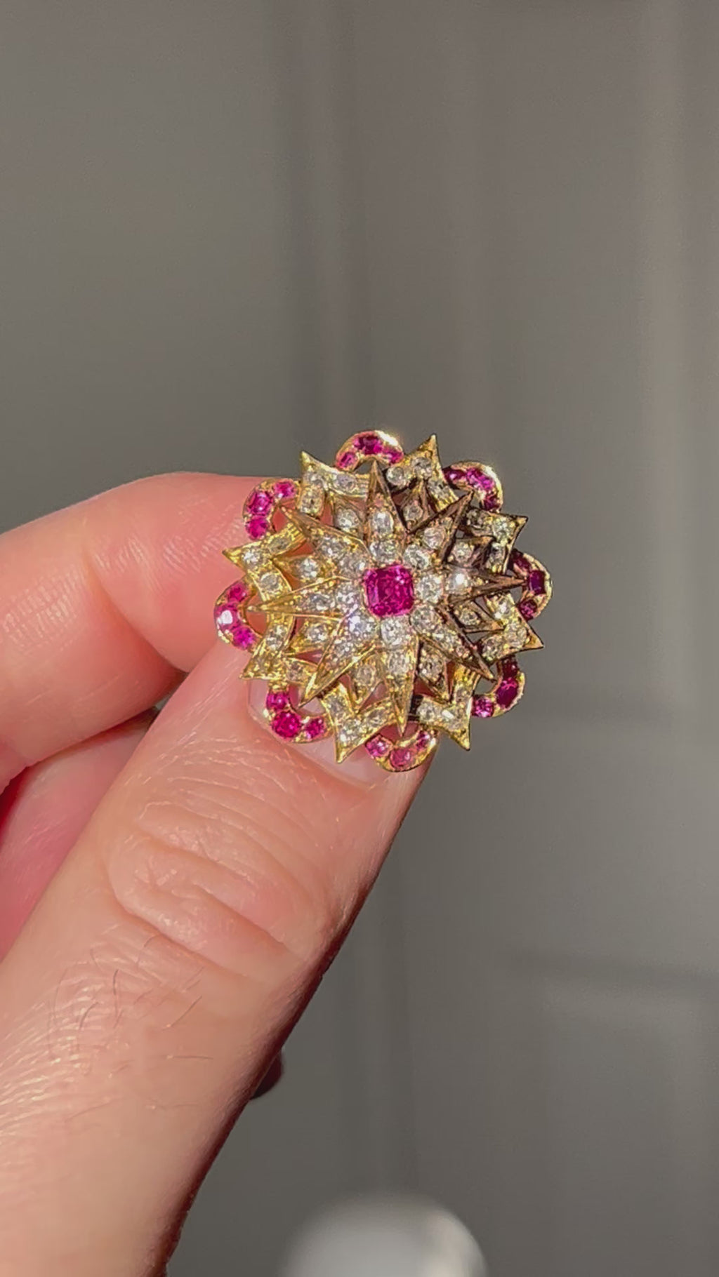 A stunning Victorian-era star brooch showcasing the finest craftsmanship. Set in 18ct yellow gold, this exquisite piece features a vibrant Burma ruby at its centre, surrounded by intricately arranged old cut diamonds that catch light with characteristic brilliance. The star motif exemplifies Victorian elegance, whilst the superior quality of both gemstones ensures enduring beauty. A treasured heirloom piece for the discerning collector or as a distinctive accessory for special occasions.