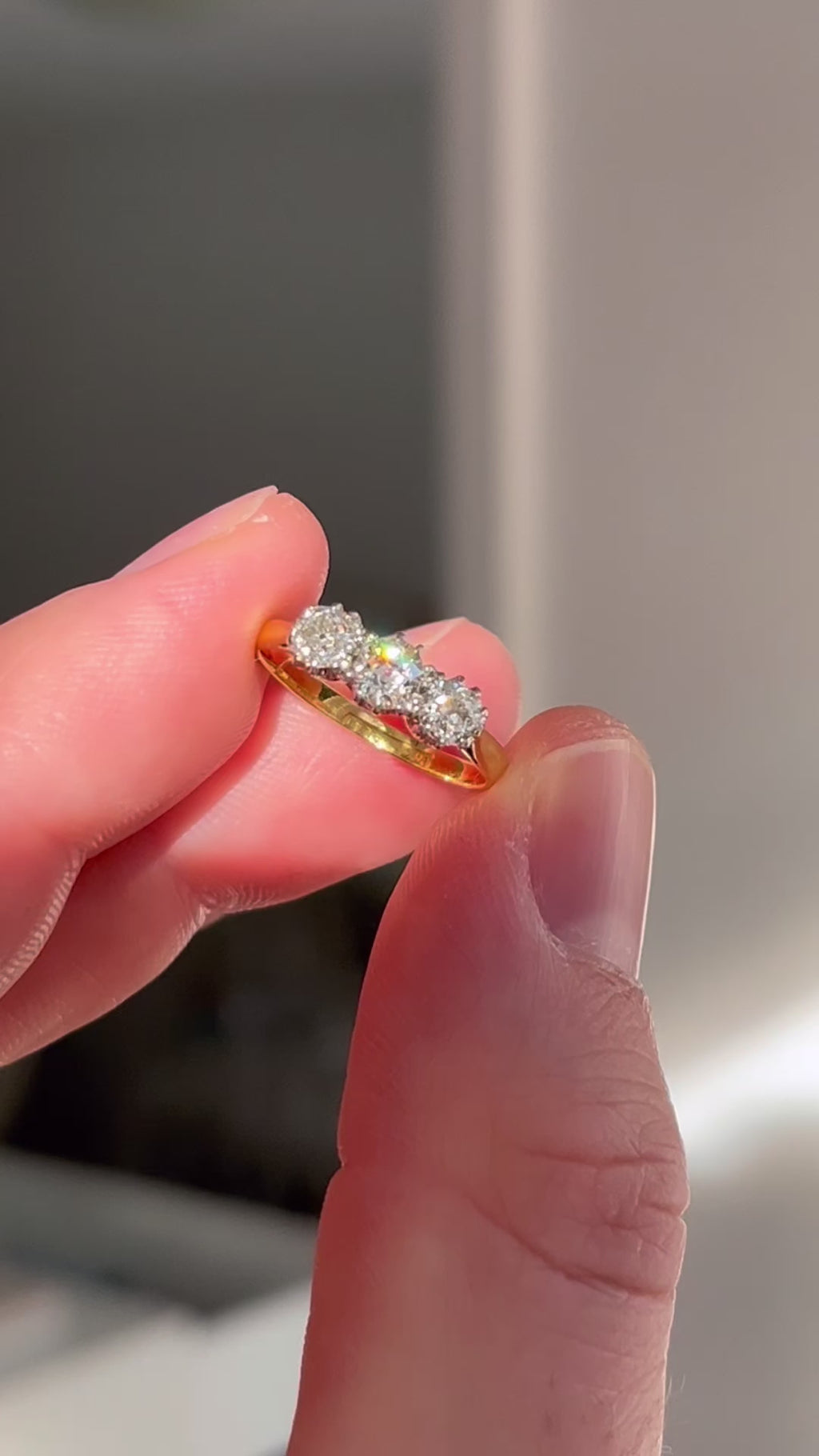 An elegant Victorian three stone ring featuring old cut diamonds with a combined weight of 0.85 carats, arranged in a classic configuration that epitomises period refinement. The principal stone is beautifully complemented by two smaller diamonds, creating a harmonious design that speaks to Victorian sensibilities. Rendered in 18ct yellow gold, the setting showcases the warm patina and craftsmanship characteristic of authentic antique jewellery. The old cut diamonds exhibit the distinctive soft luminescence prized by connoisseurs of vintage pieces. A distinguished choice for those seeking genuine historical significance paired with enduring beauty and exceptional quality.