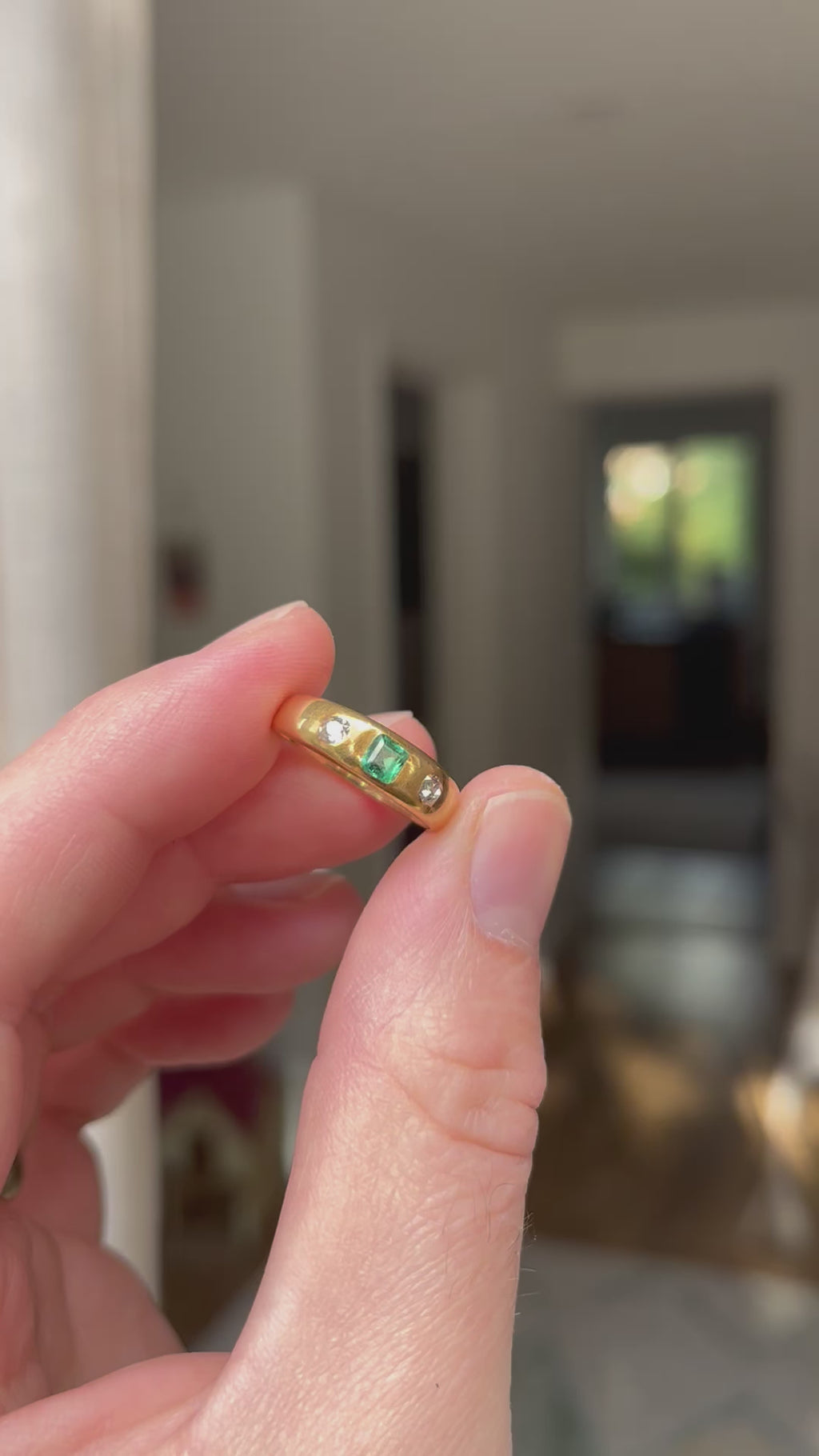 A beautiful antique Victorian emerald and old cut diamond three stone ring. The central Colombian emerald is a vibrant green emerald cut and has been closed set in-between two old cut diamonds. The band has been crafted in solid 18ct yellow gold.