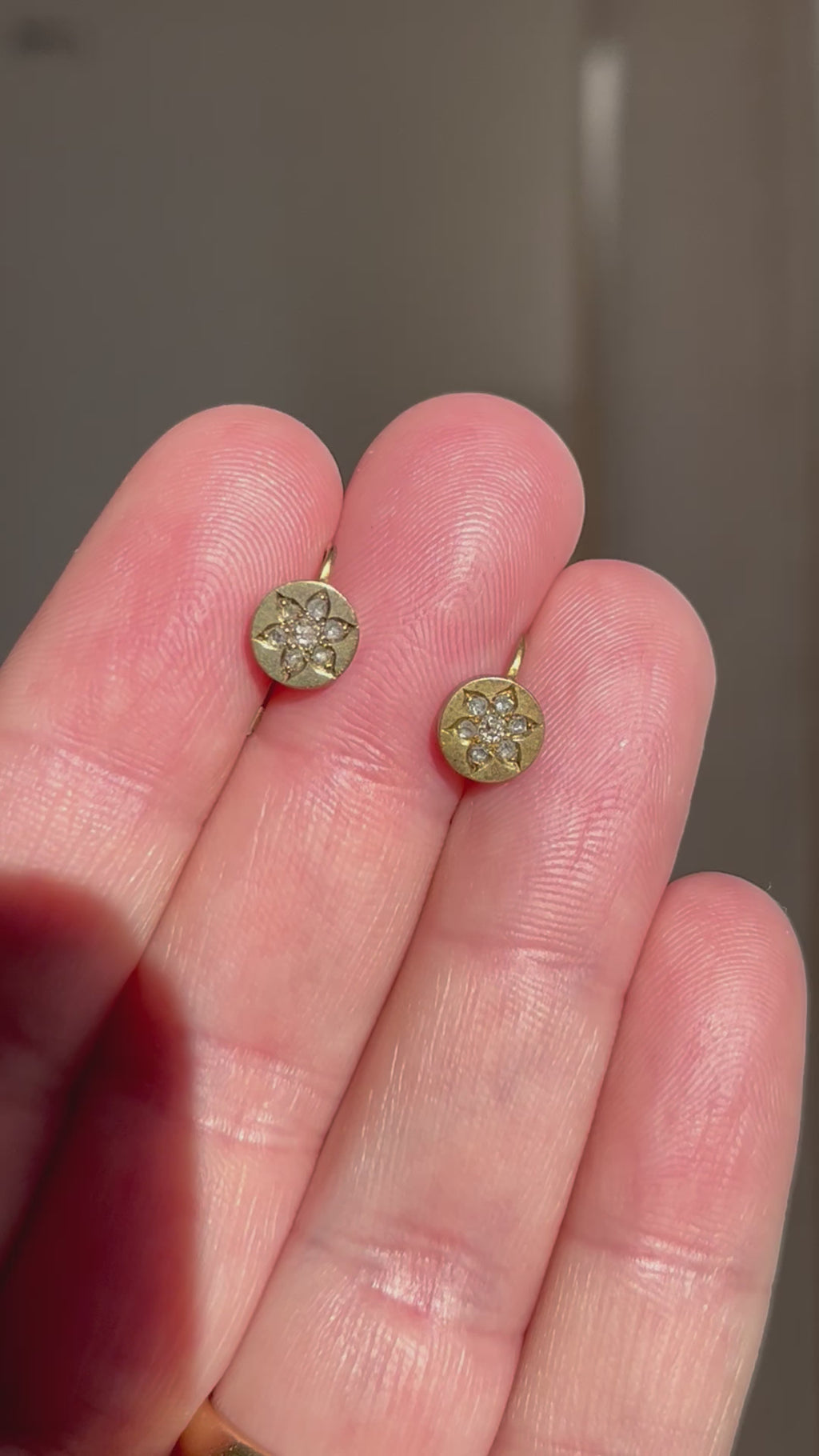 A fine pair of Victorian diamond cluster earrings. Each earring has been set with an old cut diamond in the centre surrounded by a cluster of rose cut diamonds in a star motif crafted in 15ct yellow gold.