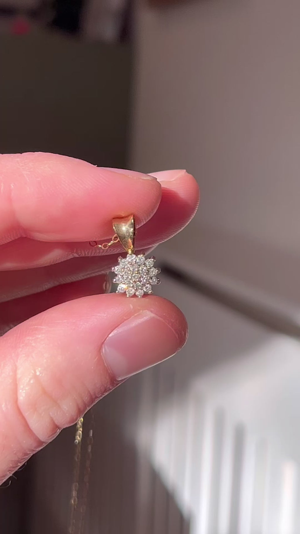 A refined vintage pendant capturing the delicate geometry of a snowflake in 9ct yellow gold. At its heart lies a lustrous diamond, gracefully framed by an artful arrangement of complementary diamonds that amplify its radiance. The warm patina of vintage gold lends an understated elegance, whilst the intricate cluster work demonstrates the meticulous craftsmanship of its era. Perfect for those who appreciate timeless jewellery with genuine character and heritage appeal.