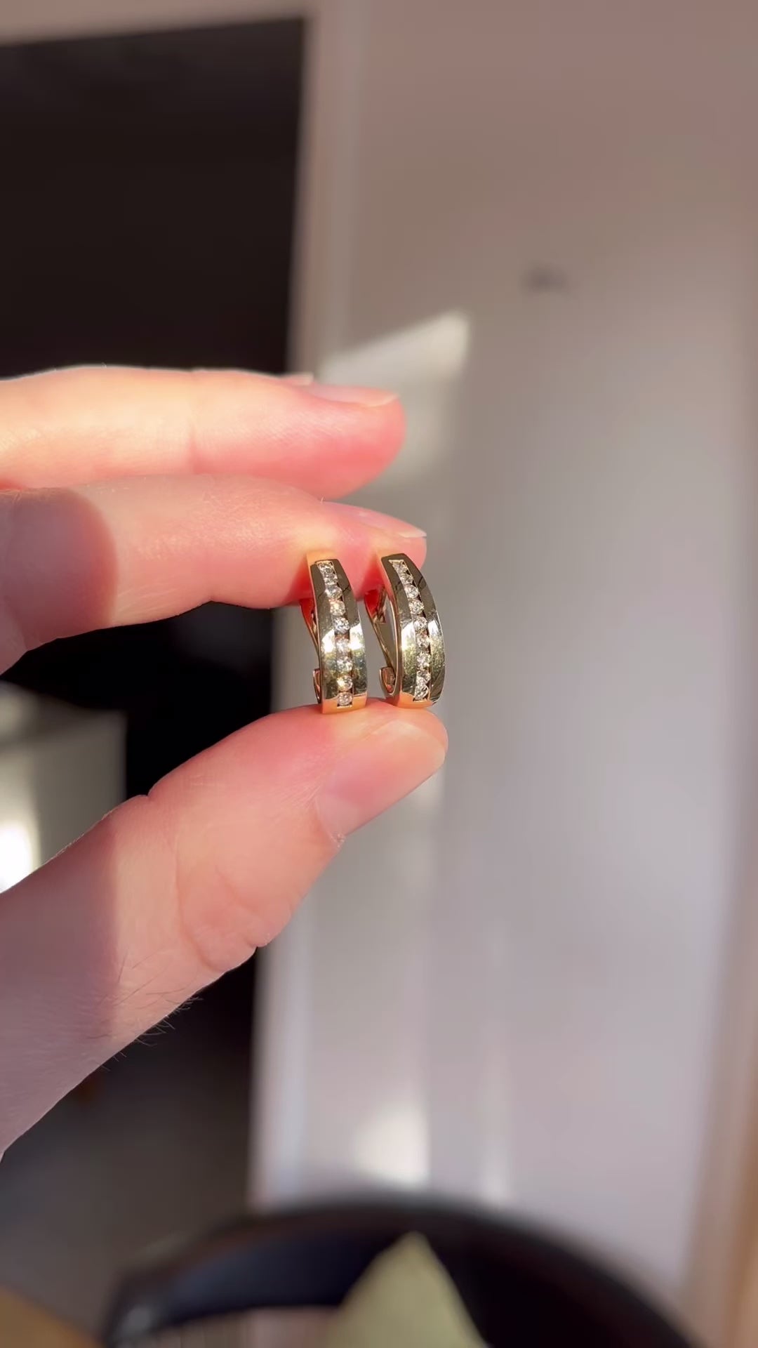 Here we have a lovely pair of vintage diamond hoop earrings. Each earring has a channel setting of round cut diamonds and has been crafted in solid 9ct yellow gold. They also feature secure latch clip fittings.