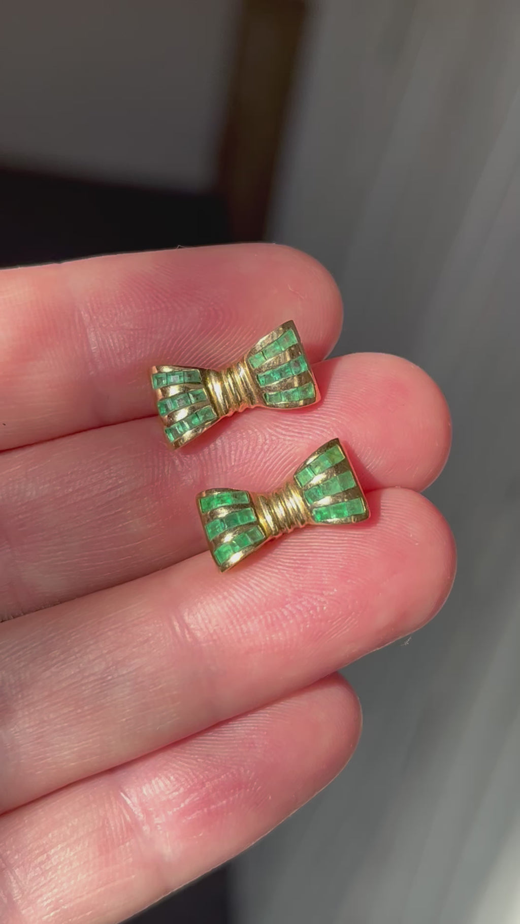 A charming pair of vintage emerald earrings in the form of a bow. Each earring features an array of natural emeralds which have been expertly channel set in a 9ct yellow gold setting with butterfly back fittings.
